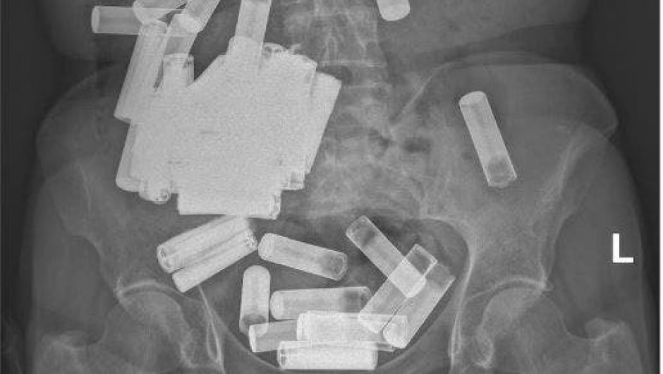 Desafortunadamente, una radiografía reveló una multitud de baterías en su abdomen, aunque afortunadamente ninguna parecía estar obstruyendo su tracto gastrointestinal y ninguna batería mostraba signos de daño estructural.